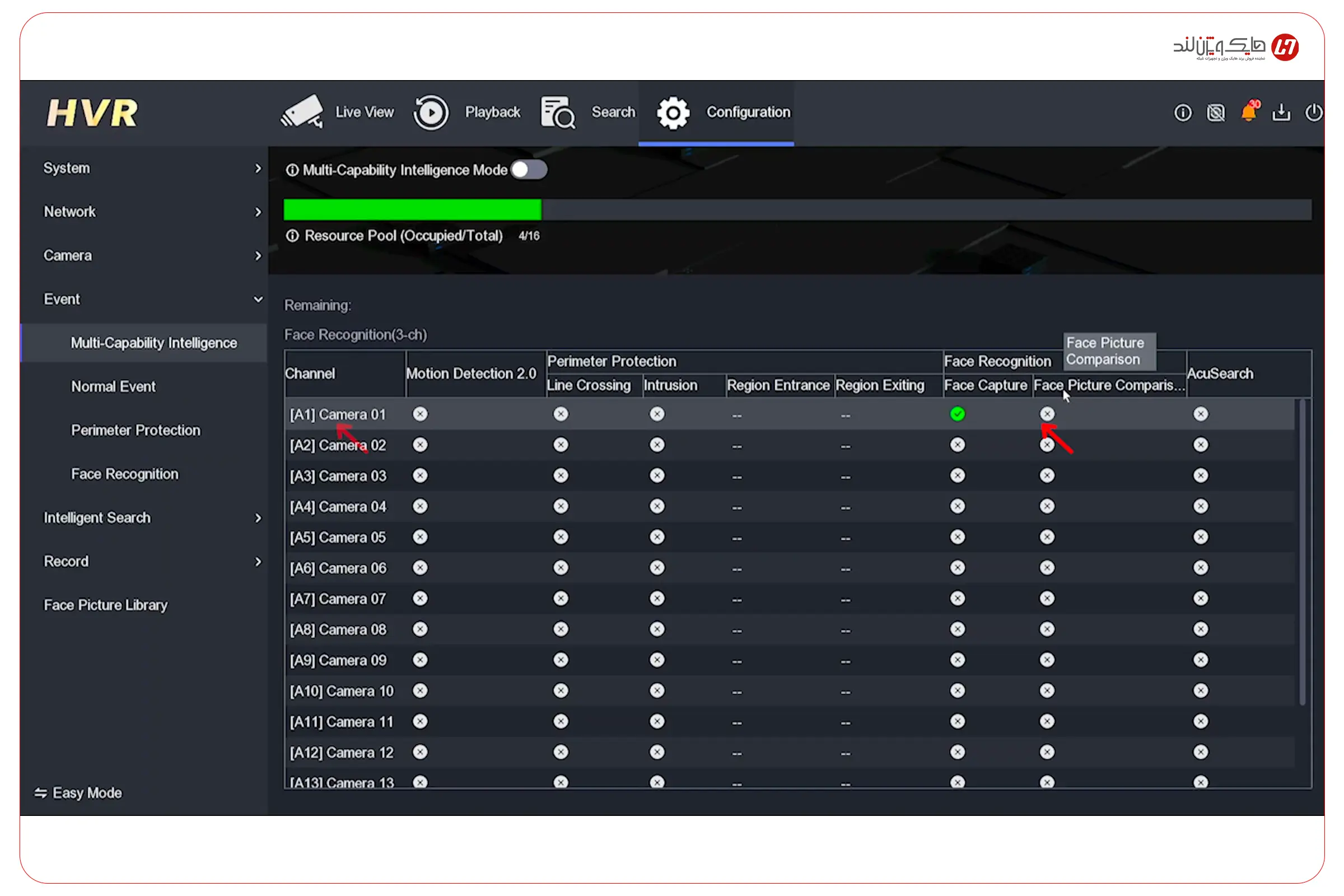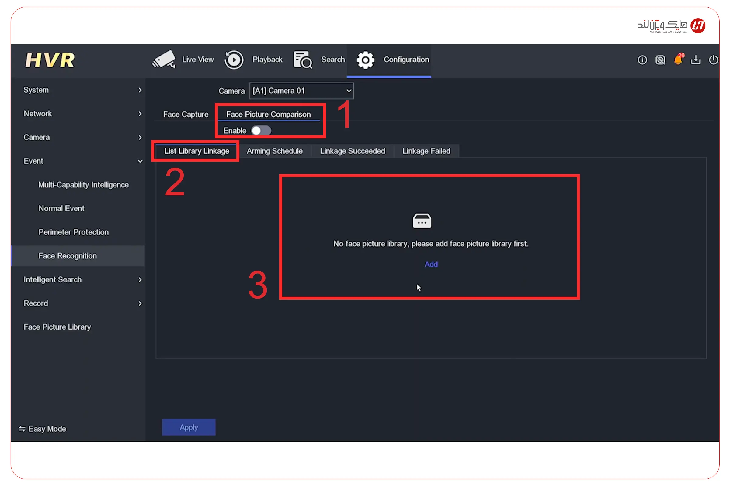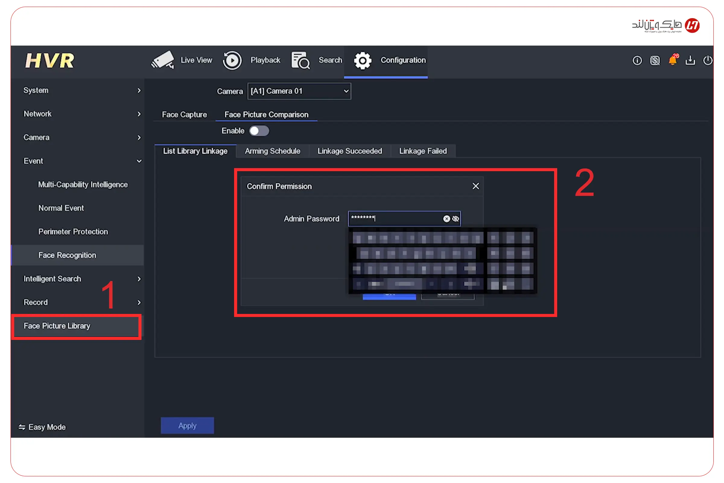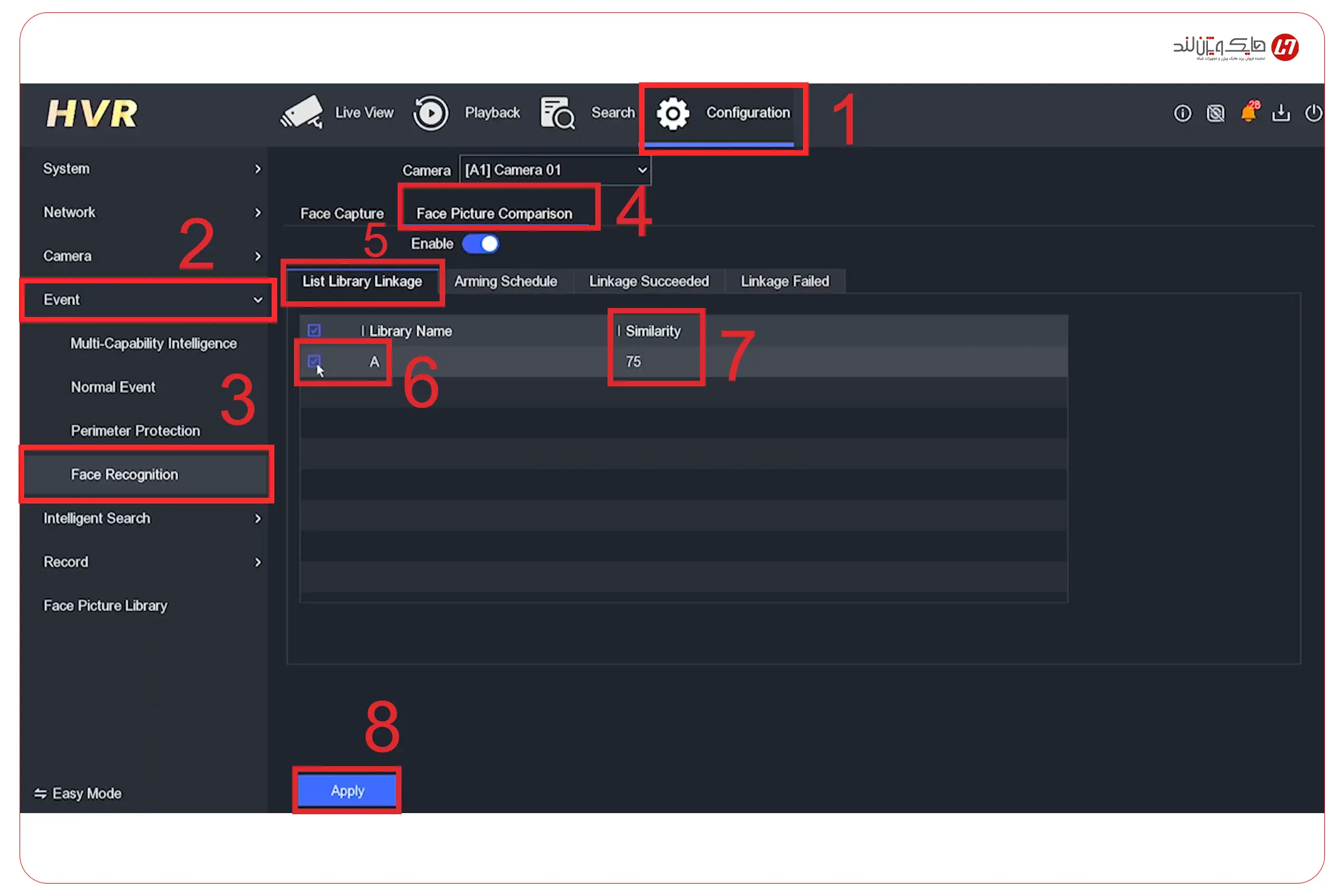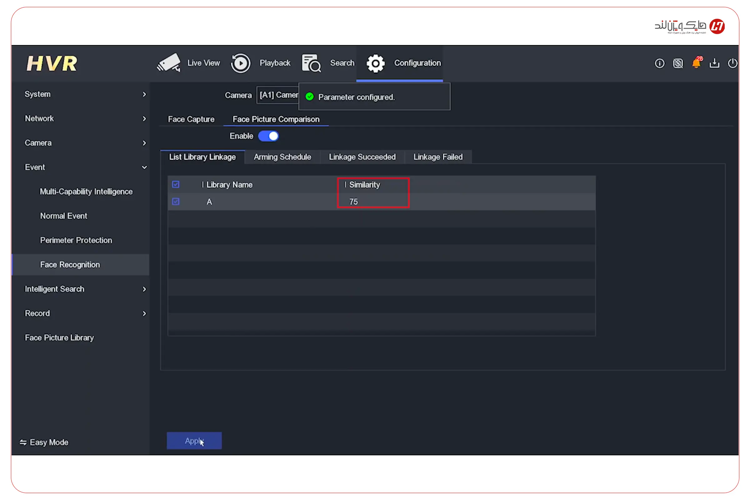 حالا که Library را ساختهاید و حداقل یک چهره مرجع داخل آن ذخیره کردهاید، وقتش است قابلیت Face Picture Comparison را برای همان Library فعال کنید تا دستگاه از این لحظه به بعد، هر چهرهای که تشخیص میدهد را با چهرههای کتابخانه تطبیق بدهد.