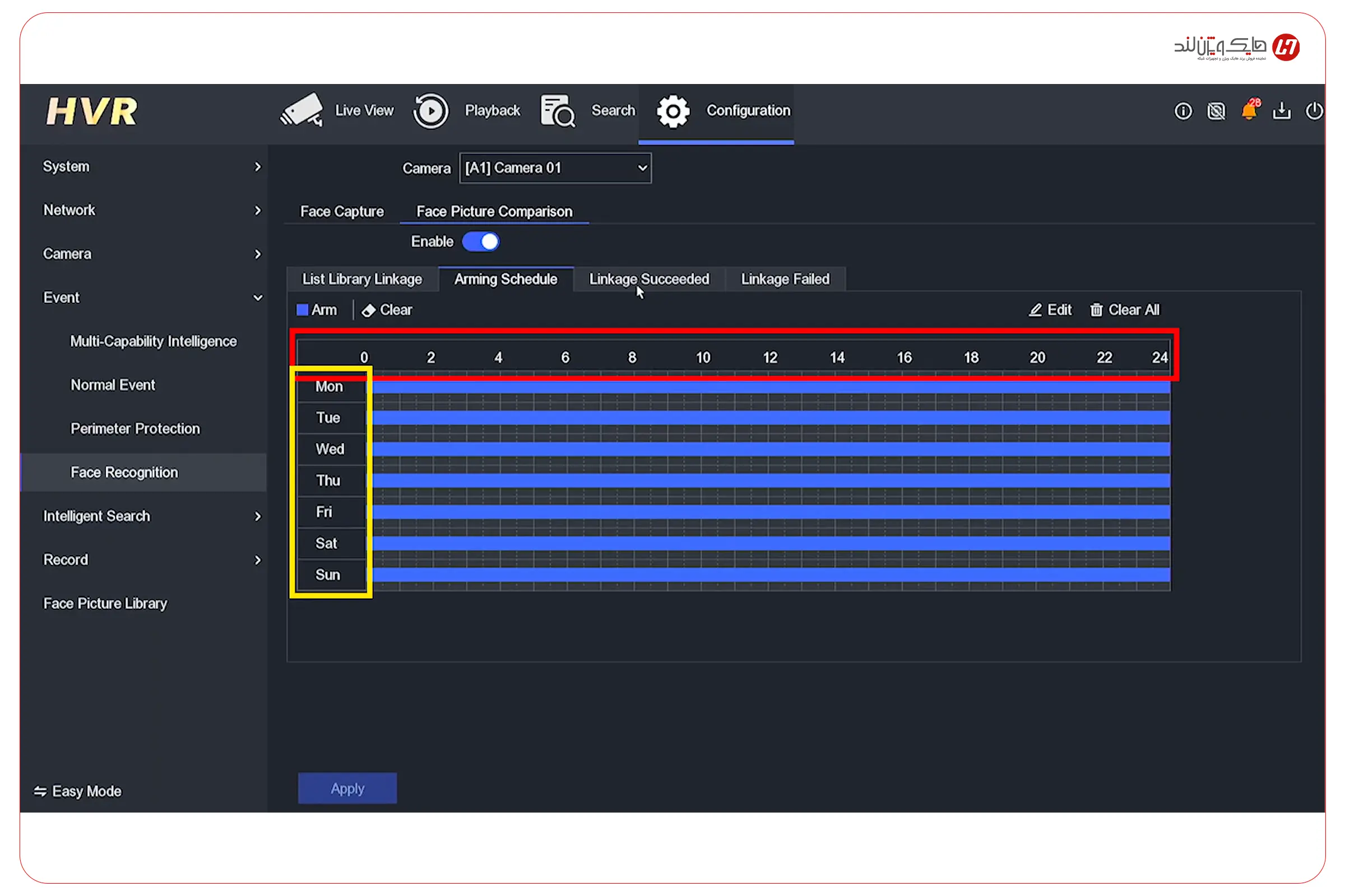حتی اگر Library را ساخته باشید، چهره مرجع را اضافه کرده باشید و Face Picture Comparison هم فعال باشد، باز هم یک مورد میتواند باعث شود «هیچ اتفاقی نیفتد»: زمانبندی (Arming Schedule). این بخش مشخص میکند دستگاه دقیقاً در چه روزها و چه ساعتهایی اجازه دارد مقایسه چهره را انجام دهد و واکنش نشان بدهد؛ پس اگر زمانبندی محدود باشد (مثلاً فقط چند ساعت خاص)، در خارج از آن بازهها سیستم عملاً بیصدا میماند.