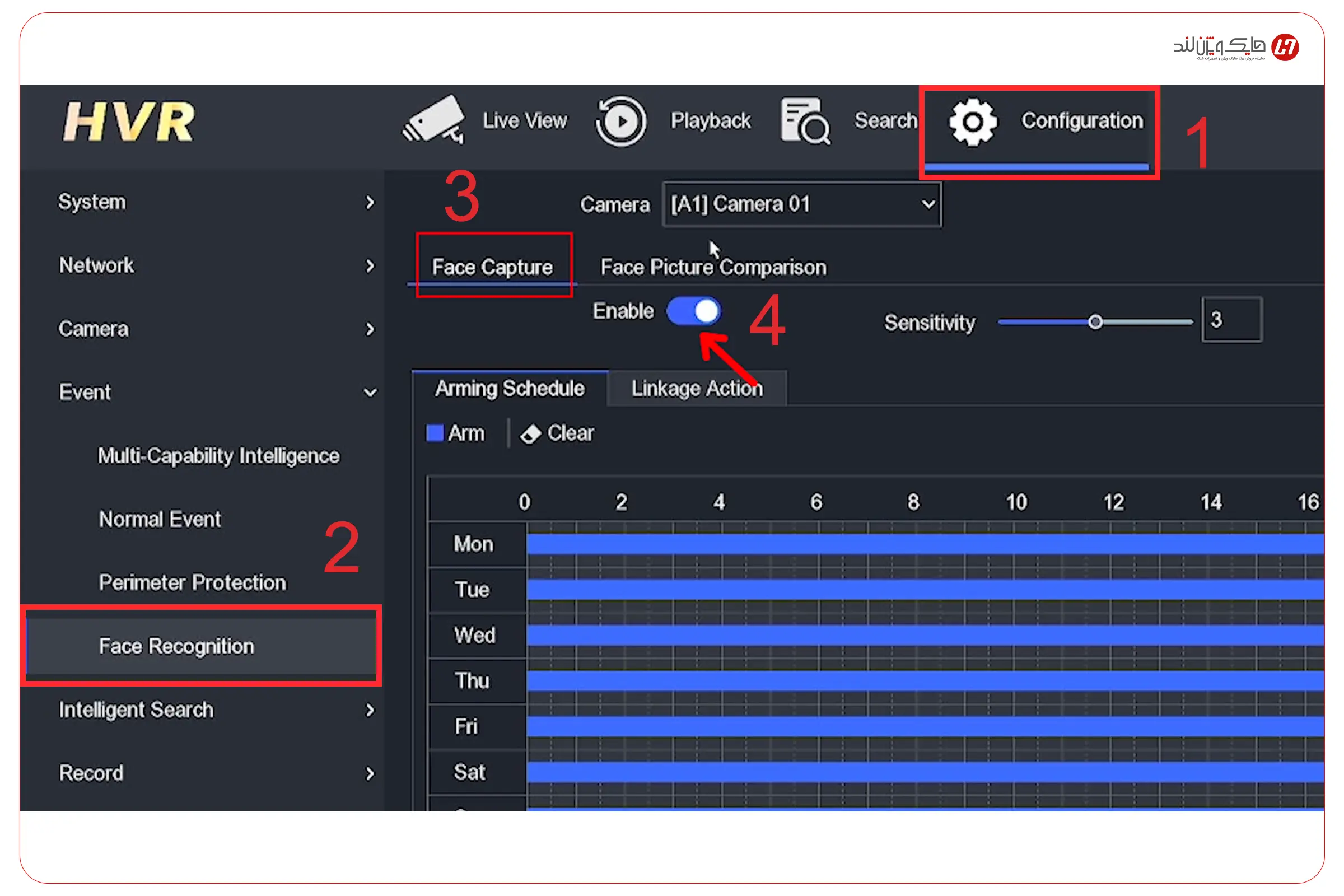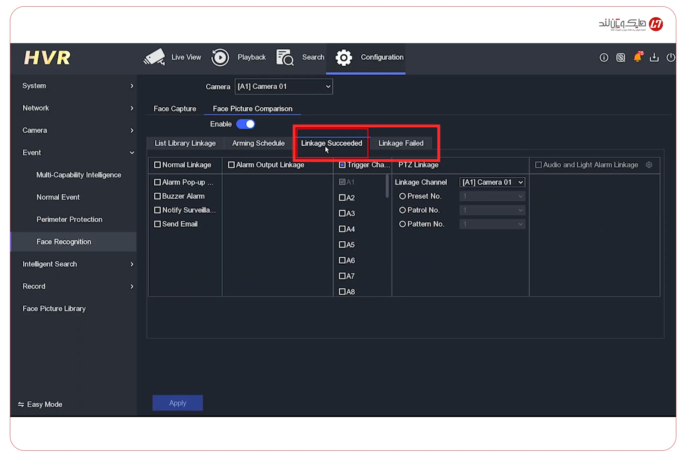 بعد از اینکه مقایسه چهره دوربین را فعال کردید و زمانبندی (Arming Schedule) هم درست تنظیم شد، مهمترین بخش این آموزش شروع میشود: اینکه دستگاه بعد از مقایسه چه واکنشی نشان بدهد. چون اگر Linkage را تنظیم نکنید، ممکن است سیستم چهره را درست هم تشخیص بدهد، اما شما هیچ اعلان، هشدار یا خروجی قابلمشاهدهای دریافت نکنید.