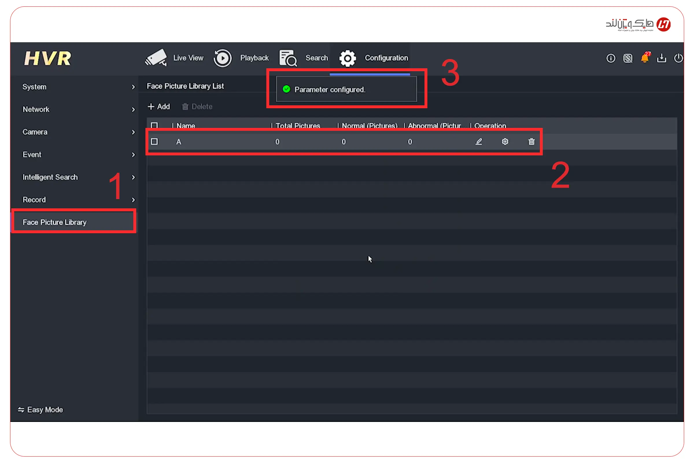 اگر Library نداشته باشید، معمولاً دستگاه پیام میدهد که ابتدا باید Face Picture Library ایجاد شود.