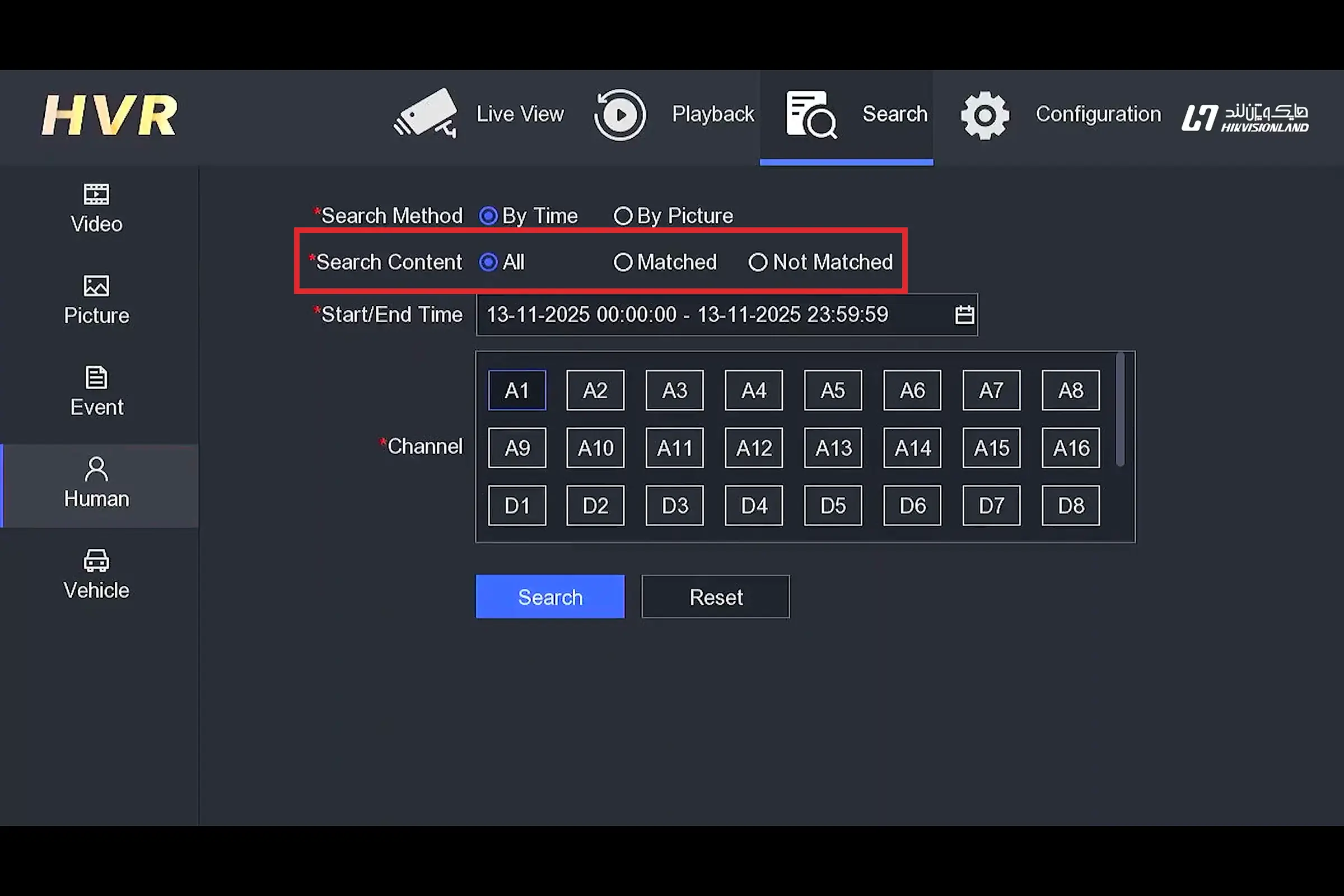 در جستجوی چهره هایکویژن (Search > Human)، بخش Search Content دقیقاً مشخص میکند دستگاه «از بین دادههای Face Capture چه نوع خروجیای را به شما نشان بدهد»؛ یعنی آیا دنبال افراد شناختهشده هستید؟ یا افراد ناشناس؟.