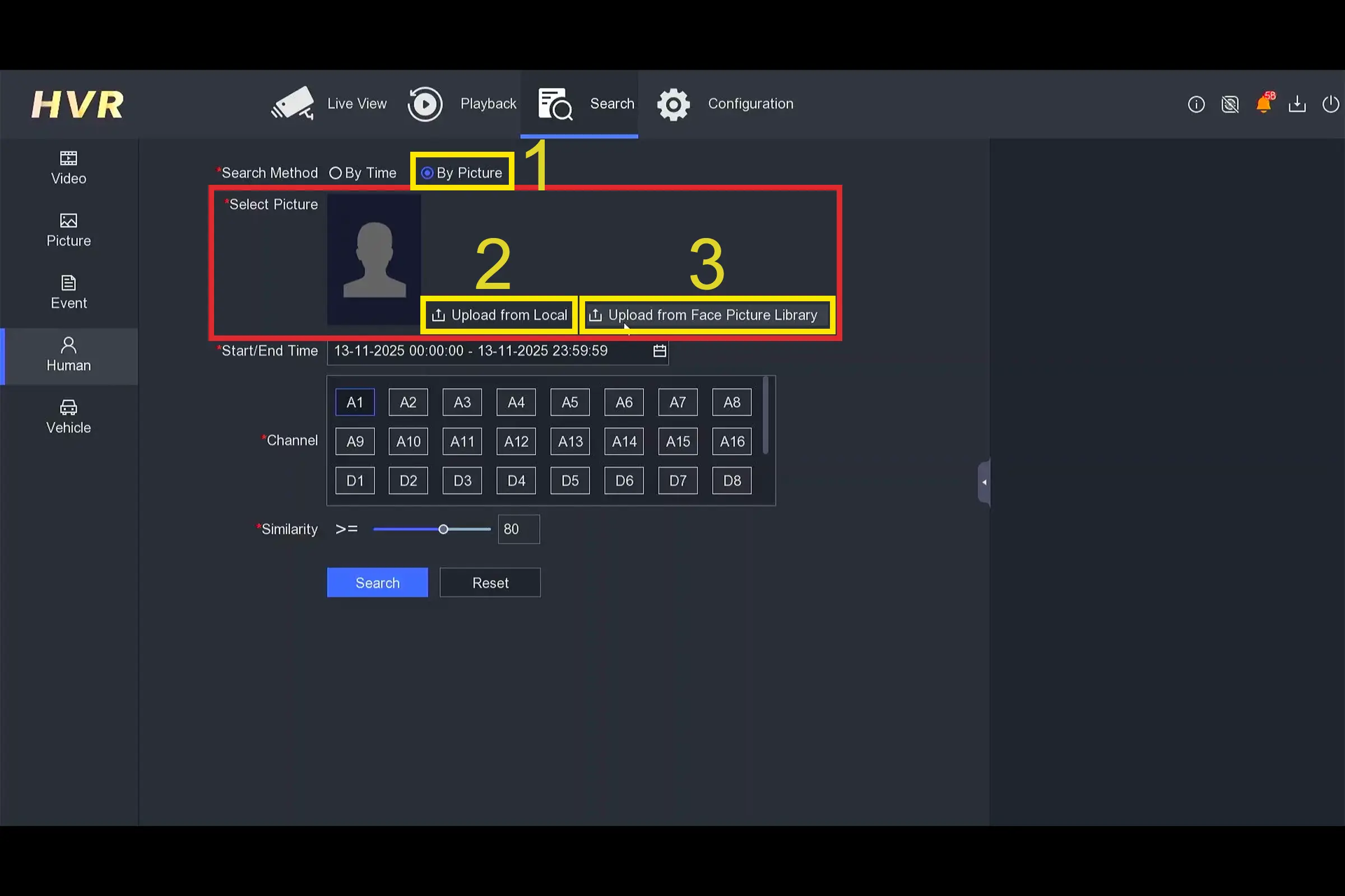 اگر عکس فرد را دارید، سریعترین مسیر در جستجوی هوشمند چهره در هایکویژن گزینه Search by Picture است. نکته کاربردی اینجاست که بعد از انتخاب این روش، یک منوی جدید با عنوان Select Picture ظاهر میشود و شما دقیقاً از یکی از دو مسیر زیر، عکس را به دستگاه معرفی میکنید.