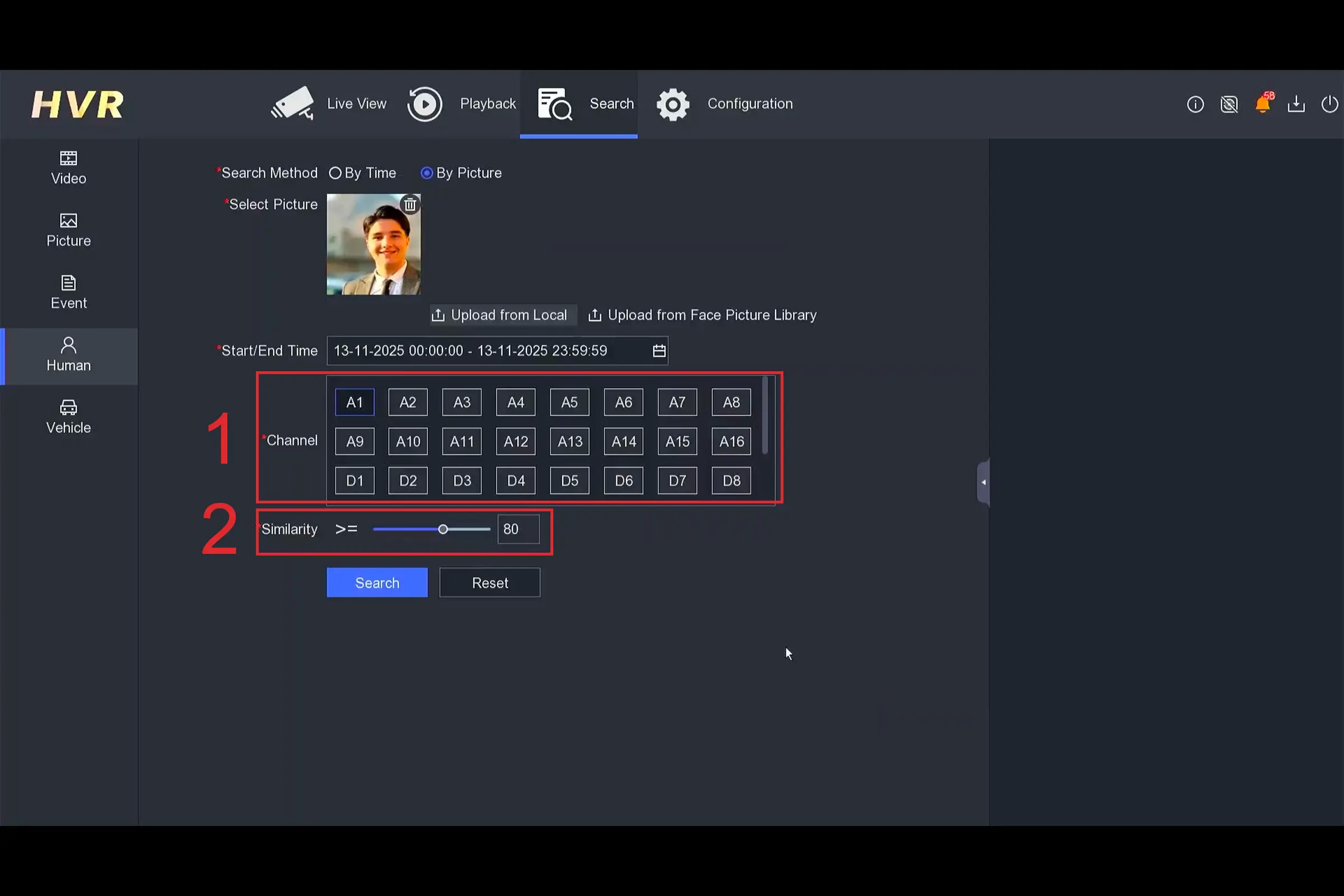 حتماً جستجو را روی همان کانالی تنظیم کنید که Face Capture روی آن فعال بوده (مثلاً A1). اگر کانال اشتباه انتخاب شود، دستگاه عملاً دیتای مرتبطی برای آن کانال ندارد و نتیجهای نمایش نمیدهد.