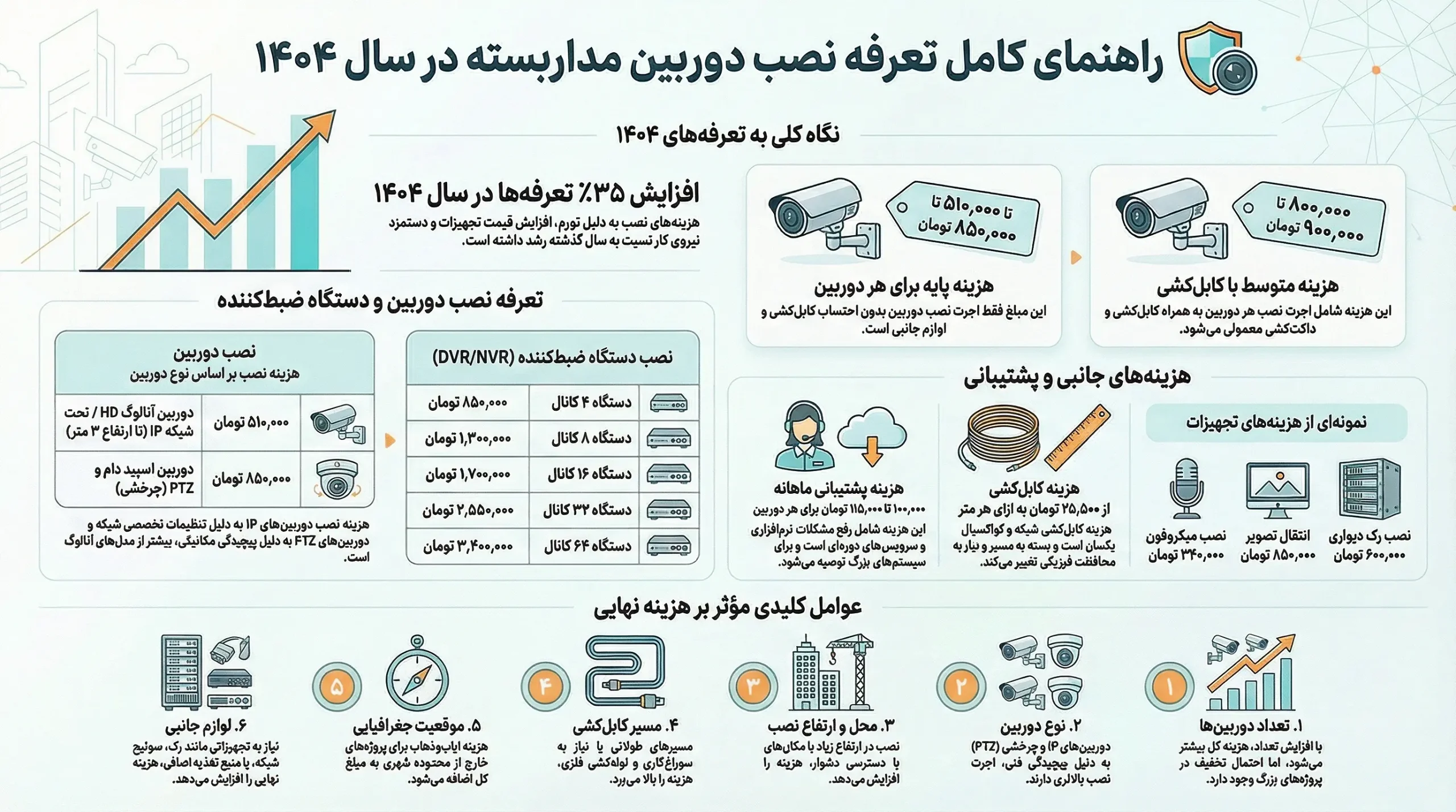 تعرفه نصب دوربین مداربسته در سال ۱۴۰۴ به دلیل عواملی مانند تورم، افزایش قیمت تجهیزات، هزینههای حملونقل، و دستمزد نیروی کار متخصص نسبت به سال گذشته حدود ۳۵٪ افزایش داشته است. همچنین نوسانات بازار ارز نیز بر قیمت تجهیزات و خدمات اثرگذار بوده است.